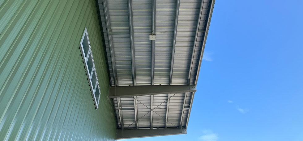 庇の下でも荷下ろしの作業がしたいということで≒5mの庇を実現。